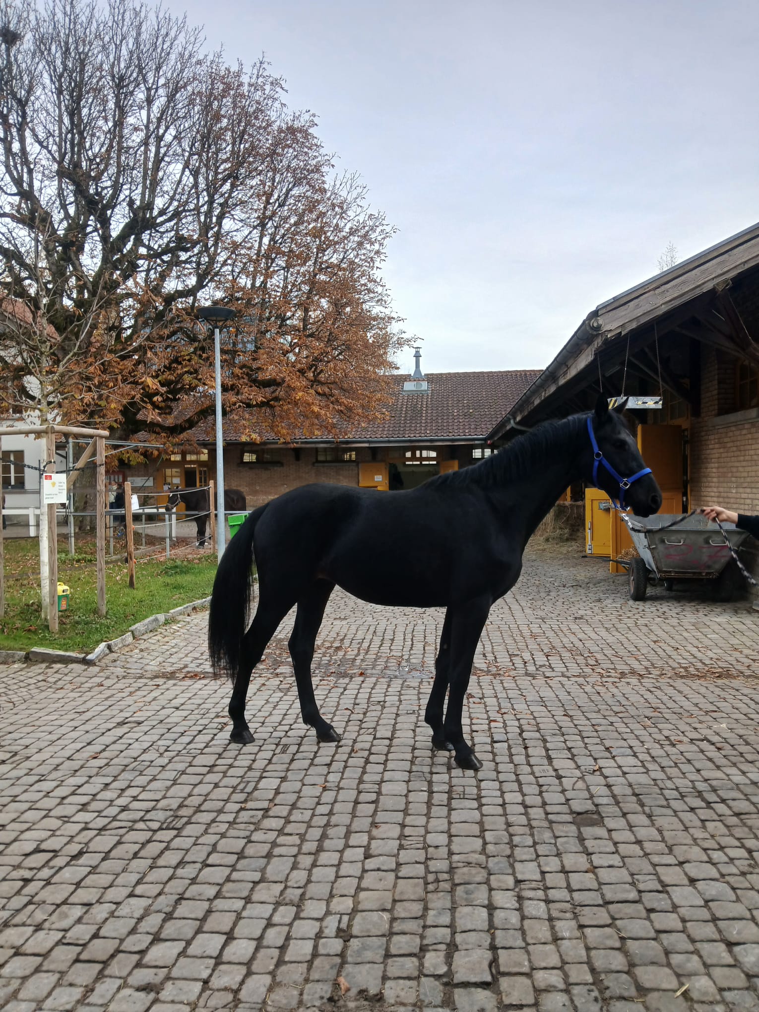 Très gentil aux soins et proche de l'homme, belles allures de base. Vit en stabulation, groupe ok, pas dominant, le boxe lui convient aussi très bien.