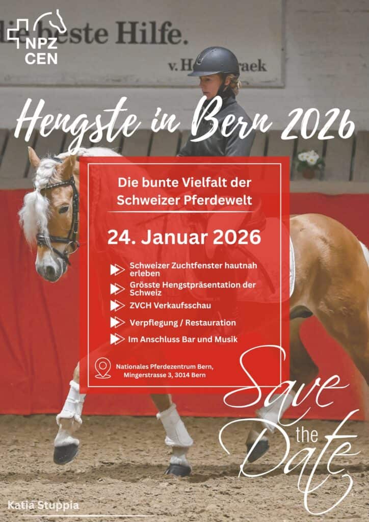 Am 24.01.2026 findet zum 24. Mal „Hengste in Bern“ statt. Die grösste Hengstpräsentation der Schweiz, lockt jedes Jahr fast 500 Personen in die historische Reitbahn 1 des Nationalen Pferdezentrums in Bern. Jährlich präsentieren sich um die 20 Hengste aus dem In- und Ausland, hauptsächlich in den Disziplinen Springen und Dressur, aber auch Fahren und Vielseitigkeit ist vertreten. Zudem werden Junghengste an der Hand gezeigt.